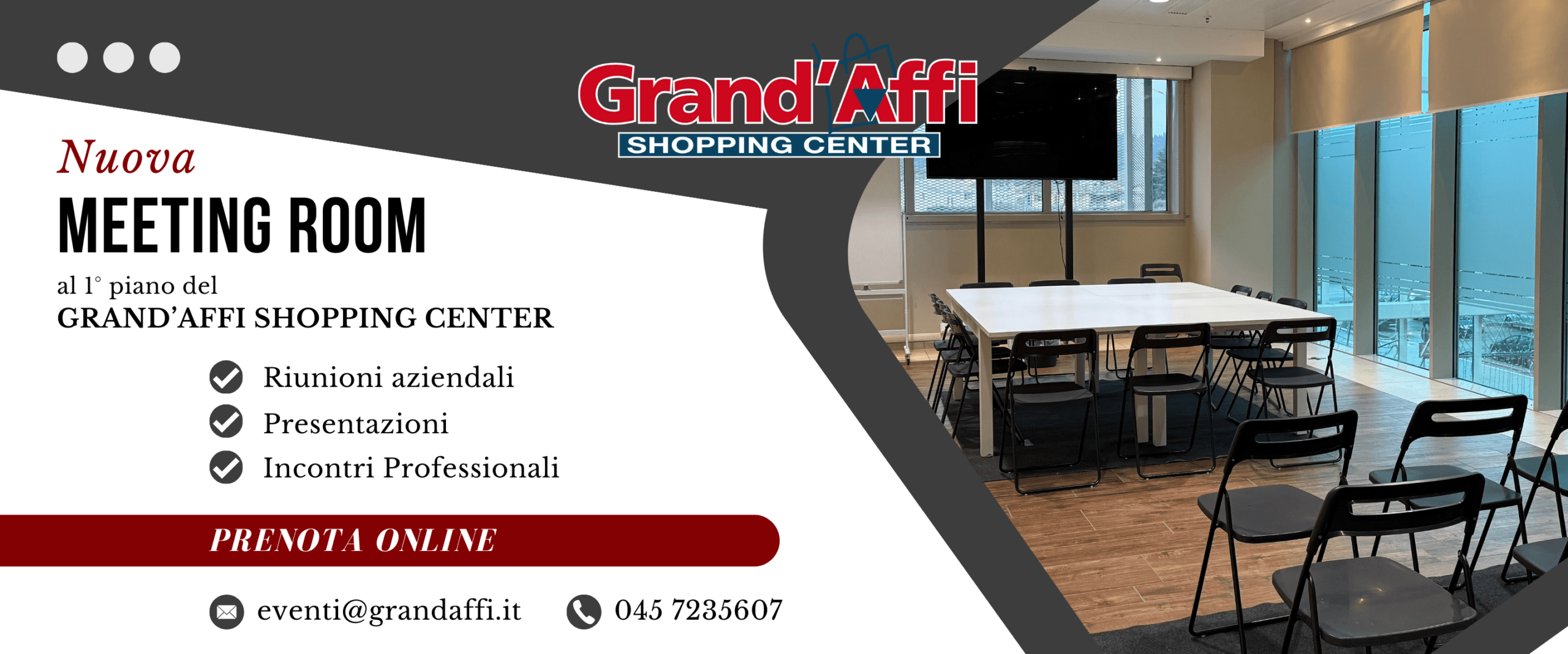 La Meeting Room del Grand’Affi Shopping Center è lo spazio ideale per aziende, professionisti e formatori che cercano una location moderna, comoda e funzionale per riunioni, corsi di formazione e incontri di lavoro.